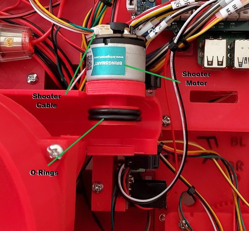 Finally, connect the Shooter Cable, attach the two O-Rings to the Flywheel and then press fit the Flywheel onto the Shooter Motor as shown: