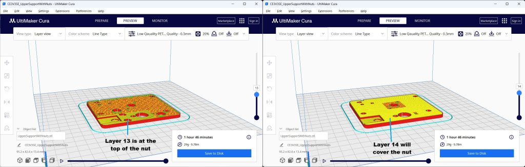 Here we can see layer 13 is the top of the nut because layer 14 covers it. This means that we need to pause the print at layer 13.