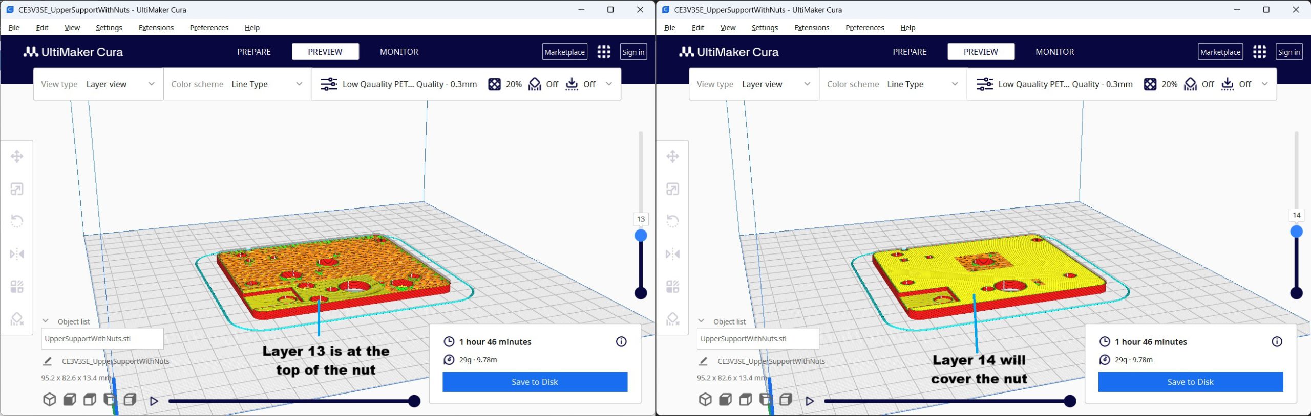 Now when you print the file, the printer will pause at layer 14. At this point you should insert the two 4-40 nuts and two 8-32 nuts then resume.