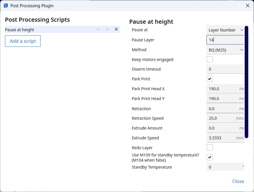 Then set the Pause Layer to 14. Also you will need to choose the correct Method for your printer. My printer needs to use the M25 G-Code command to properly pause the printer.