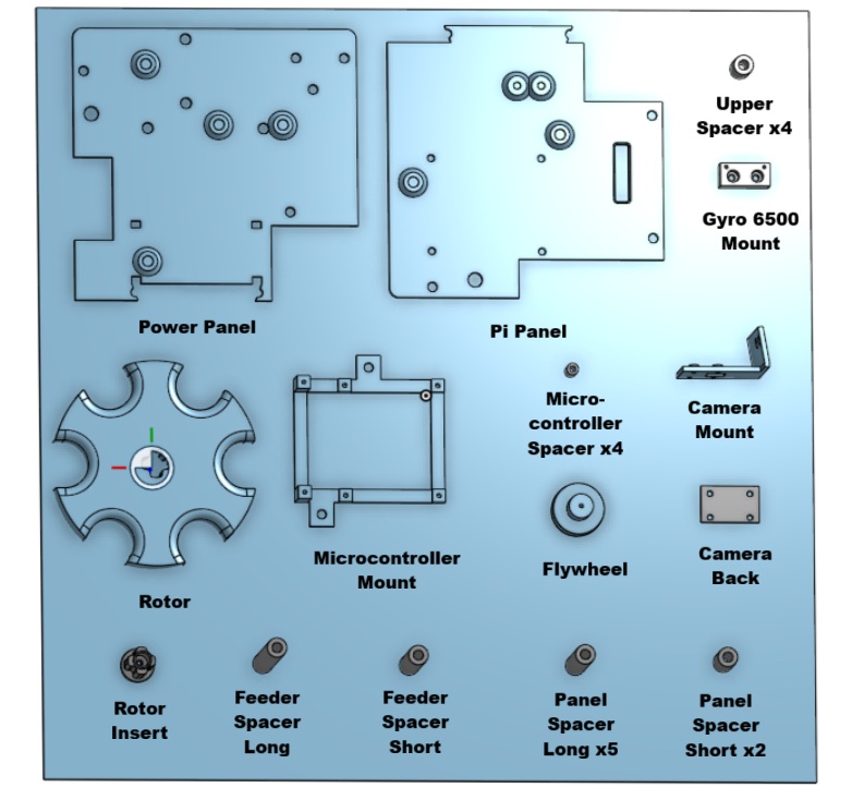 The panels come in two versions, one with embedded nuts and one that requires inserts. The Flywheel should be printed with 100% fill to maximize it’s moment of inertia.