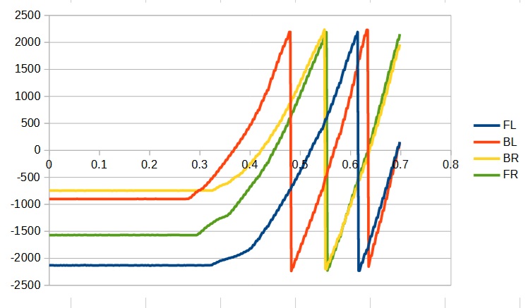 When you do this, you need to log the position of the wheels to the console in a CSV format so you can plot it in Libre Calc. Note that when you do this, the wheels need to be under load. That is they should be in contact with the surface.